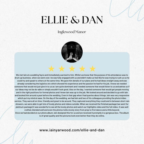 My couples tell me how much I put them at ease, during not only the run up to their big day, but on the day itself. Having done hundreds of weddings over the years, you can be rest assured that I've seen it all, and will always do everything I can to make sure the day runs as smoothly as possible. After all, if my couples are happy, and chilled on the day, it makes their photos and videos look even better!!